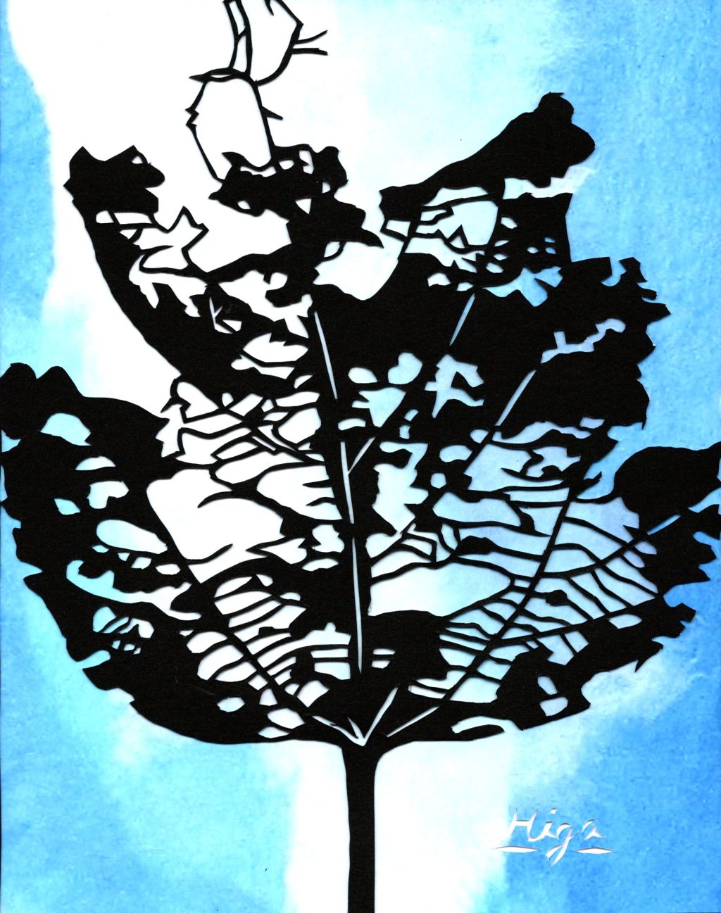 山道に池があり、川遊びの仲間と出会った。トレーに、沢蟹、川虫、枯れ葉が保存されていた。枯れ葉は、川の中で侵食、葉と葉脈がかろうじて繋がっていた。仲間が「これきりえにしたら」とアドバイスしてくれた。早速、スマホで撮影、きりえ作品に仕上げた。
